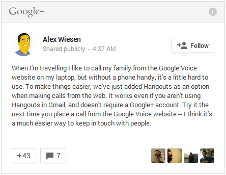 هم اکنون از طریق Google Voiceمی توانید بدون نیاز به وصل شدن به اکانت گوگل پلاس از طریق Hangouts، یک تماس اینترنتی برقرار کنید.
